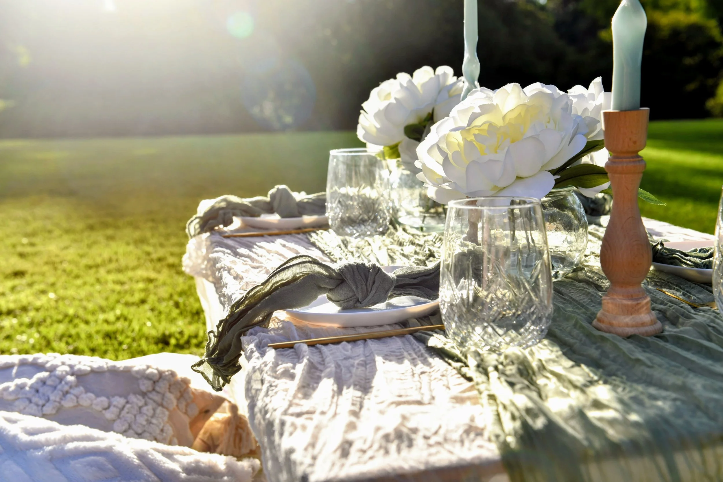 Elevate your next outdoor gathering with our Sage themed picnic package. This classy picnic package includes cream and sage table linen with touches of gold décor.